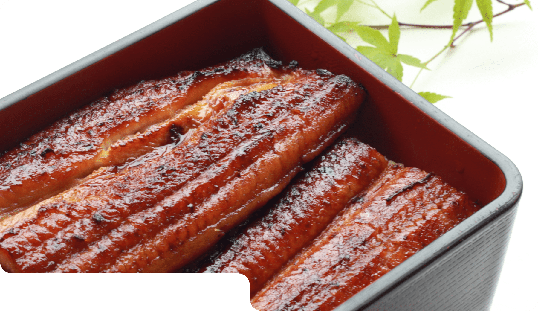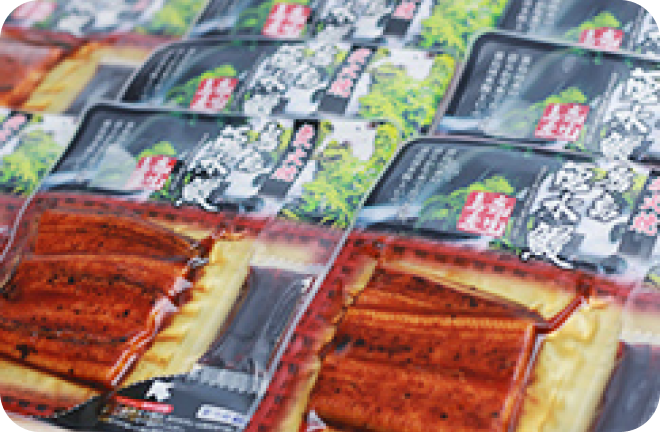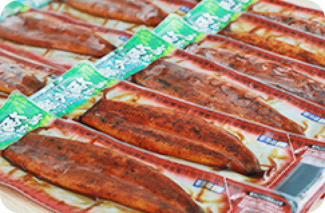 鰻は蒲焼きとして食べやすく調理されており、そのおいしさから、お子様からお年寄りまで幅広い世代に愛されています。とりわけ毎年土用の丑の日が近づくと、テレビや新聞など各メディアに取り上げられお祭りのような大きな盛り上がりをみせ、日本人なら口にすることが多い食材です。当社では、鰻蒲焼の長焼や串が刺さったもの、食べやすくカットしたものなど、さまざまな形態を取り扱っており、幅広いお客様のニーズに応える商品提案を行っています。