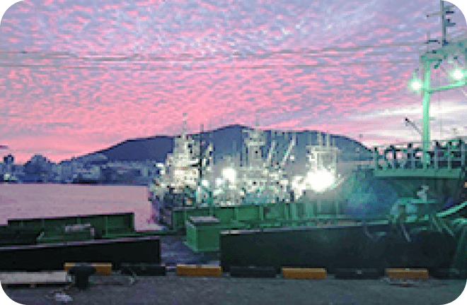 製品を通年安定して供給する為に魚の旬の時期に水揚げ地まで赴き、現地で検品を行います。ここでは、鮮度・品質・脂質・相場などを加味して仕入れを行います。近年は異常気象による海水温の上昇等の影響で旬の時期がずれることが多く、また上質な原料が少ない傾向があり、年々原料魚の仕入れは厳しさを増しています。