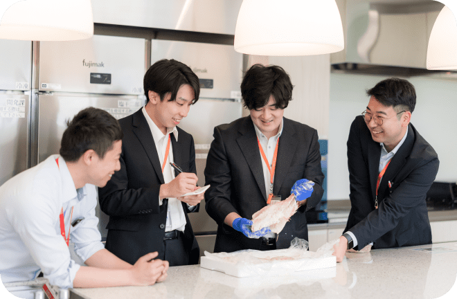 一般消費者様の消費動向を分析し、原料となる魚の水揚げ状況と相場から、スーパー様・量販店様などに最適な干物を提案するためマーケティングを行います。(販売データ、家計データ、食卓データ等を分析し、商品を提案します。)